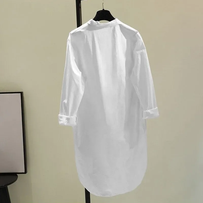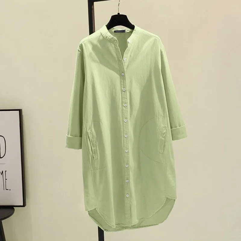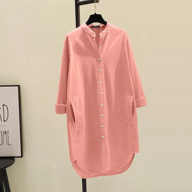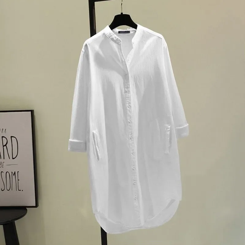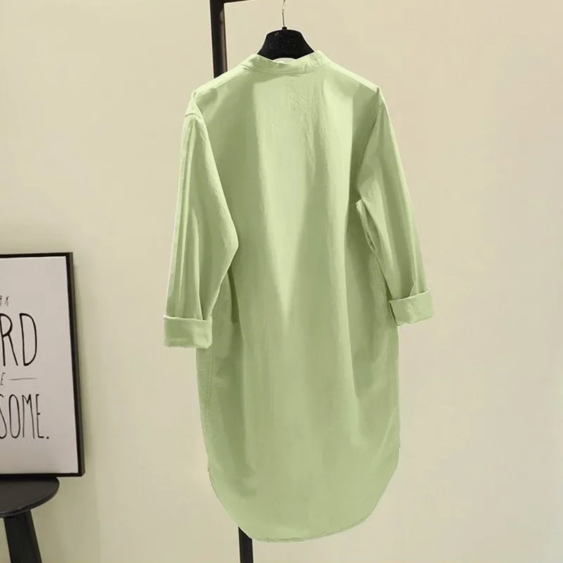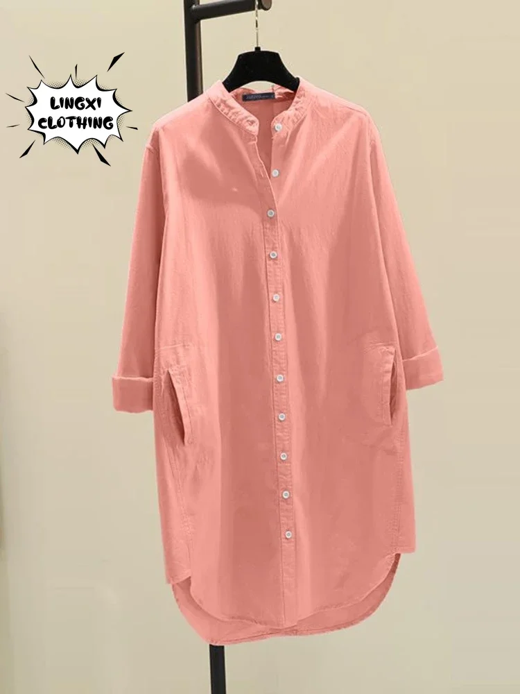 Fashion New Elegant Solid Cotton Linen Women’s Shirt Single Breasted Round Neck Casual Commuter Style Mid Length Shirt