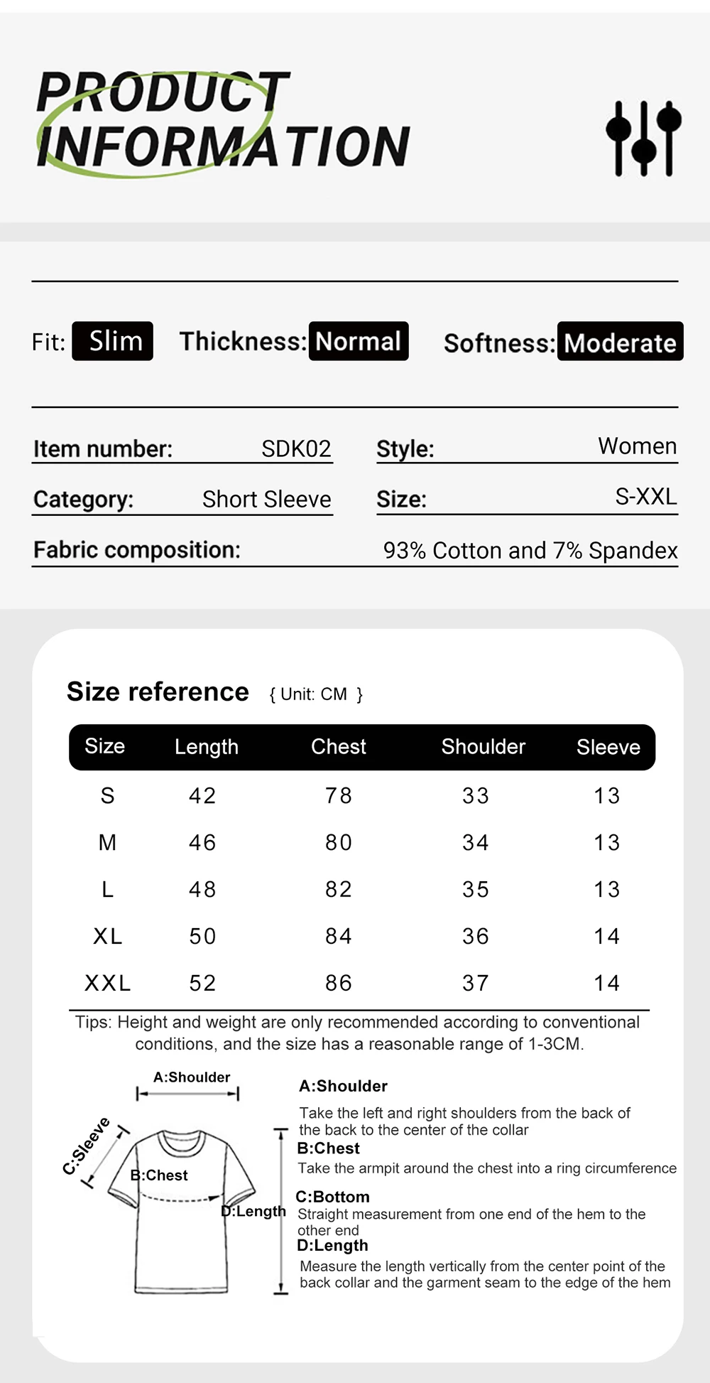 – Fabric: 93%Cotton 7%spandex