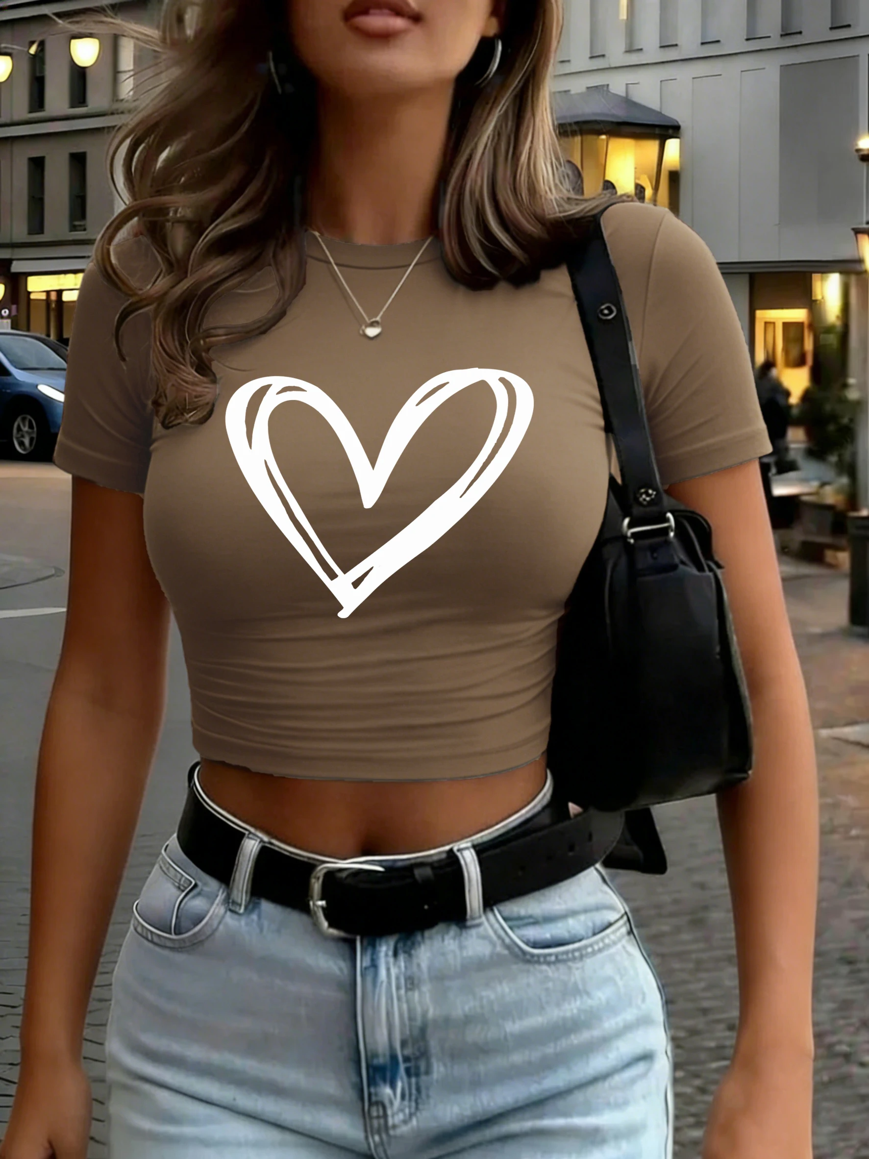 Simple Hollow Out Heart Design Crop T-Shirt Womens Crewneck Summer Tee Shirts Y2K Soft Tight Clothes Comfortable Casual Tops