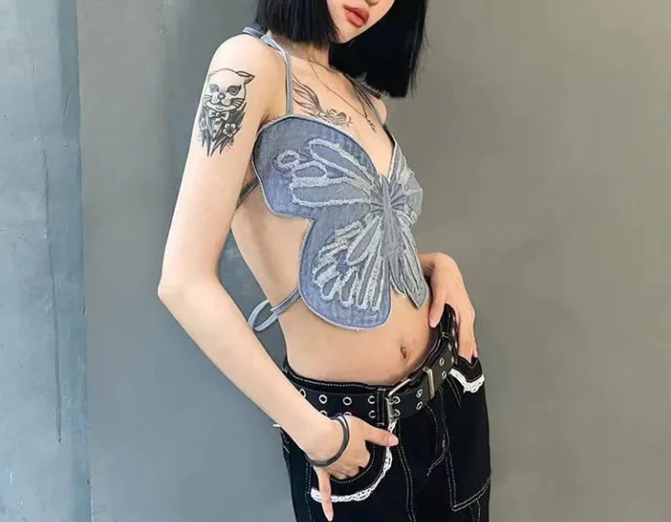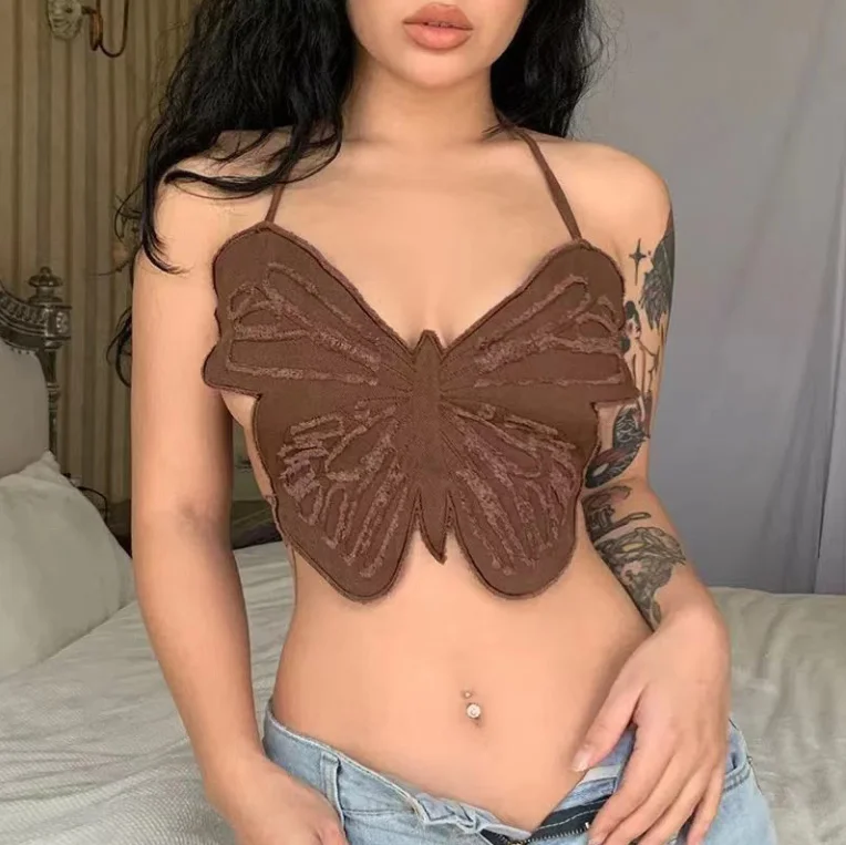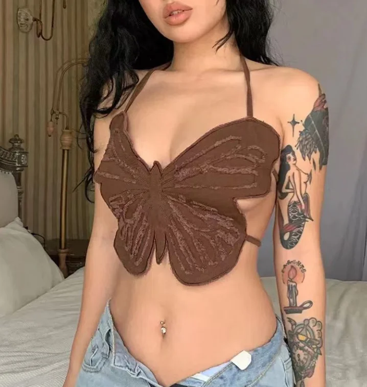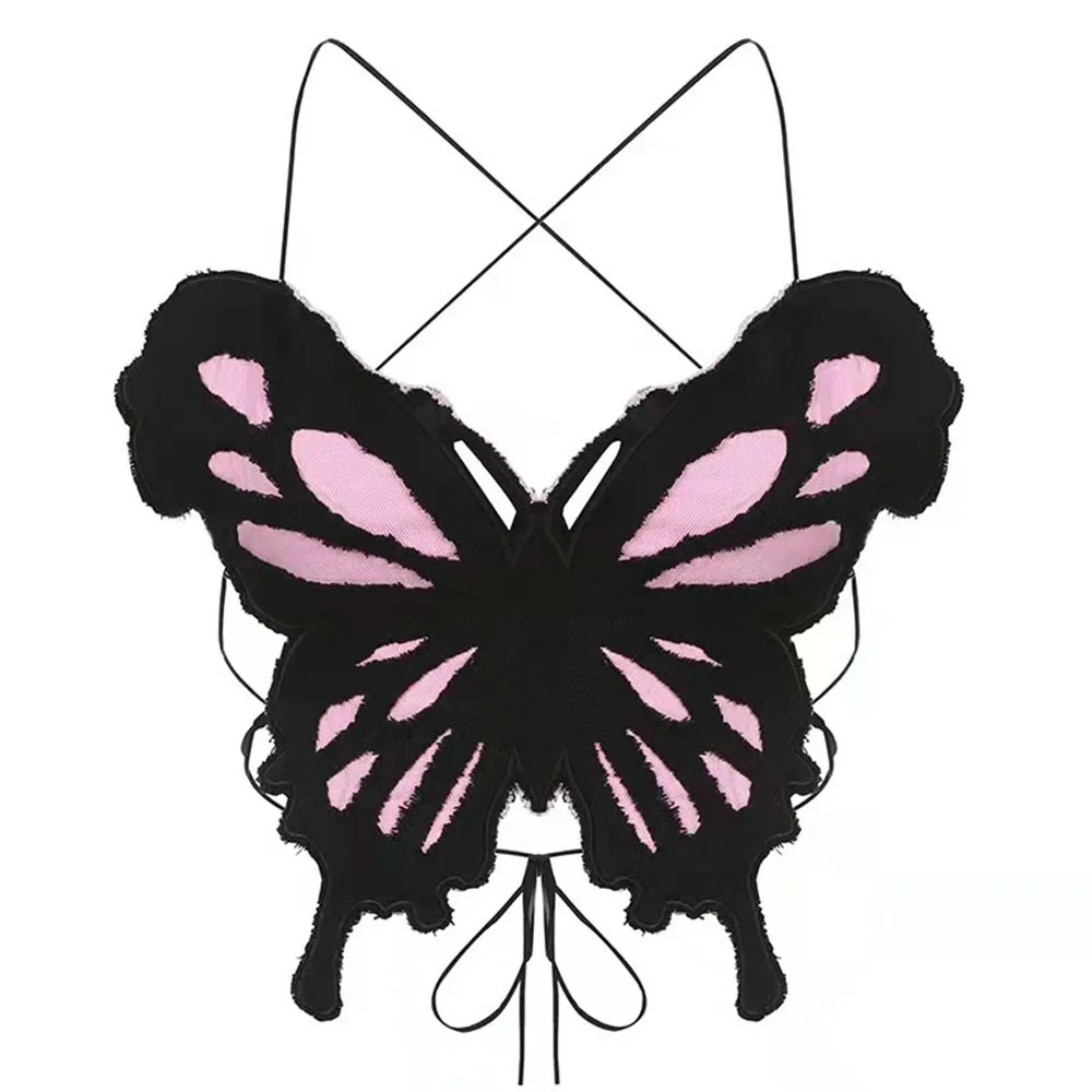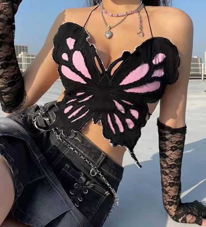 Summer Y2K Tops Woman 2025 Butterfly Pattern Design Tank Top Women’s Sexy Girl Backless Hanging Neck Tie Sexy Niche Camisole Top